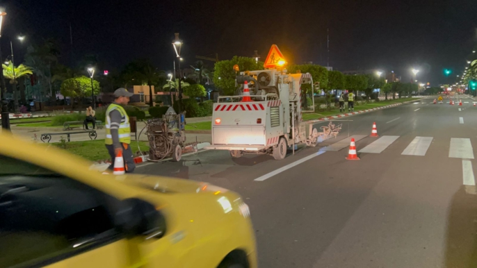 ولم تتوقف الآليات أو تهدأ حركة العمال ببعض الشوارع الرئيسية، وعلى رأسها شارع محمد السادس؛ حيث عاينت “كشـ24” استمرار أشغال صباغة ممرات الراجلين، وتجديد الأرصفة، ووضع علامات التشوير الأرضي، في عمل متواصل امتد حتى الساعات الأولى من صباح يومه الأحد، حيث حول المسؤولون ليل المدينة إلى نهار في سباق مع الزمن لإخفاء ندوب مجموعة من الشوارع الرئيسية.